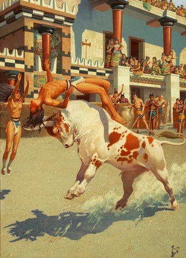 This wasn’t a myth. It was a real and awe-inspiring tradition, believed to be part sport, part sacred initiation. Young Cretans would run toward bulls, seize their horns, somersault over their backs, and land behind them — not to kill, but to prove strength, agility, and bravery. The bull, far from being slaughtered, was revered as sacred.